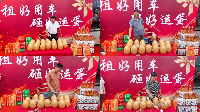 交车的喜悦尚未散去,“租好用车,砸好运蛋”互动环节热烈开启!十位首批幸运司机分批上台,手持金锤,在全场来宾的齐声倒数中,满怀期待地敲向象征好运的金蛋。清脆的破裂声与热烈的欢呼交织,汇成一片欢乐的海洋。本次砸金蛋环节奖品丰厚、贴近生活,涵盖好用生态品牌文化衫、国家非物质文化遗产——芜湖铁画等。最令人动容的是,每位司机砸出奖品时脸上洋溢的灿烂笑容,引来掌声如潮,大家共同分享这份惊喜与喜悦。金蛋开启,好运相伴,这一环节不仅为司机家人送上了暖心福利,更以互动性强、趣味浓厚的方式,生动传递了好用车及宁波瑞安对司机家人们的深切关爱与美好祝愿,与庆典主题交相辉映。