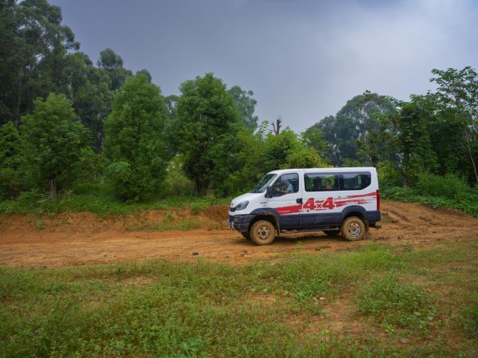 从鸡窝坑脱困而出,经过一段小树林,就来到第二个关卡——交叉轴路段。对拥有全时四驱+三把锁的依维柯欧霸·山海来说,想要通过这一关,其实并不困难,只需在低速四驱模式下锁止中央差速锁,万一遇到单侧后轮打滑的情况也没关系,只要启用后桥差速锁,让两个后轮同步转动,获得相同扭矩,一样可以轻松脱困。