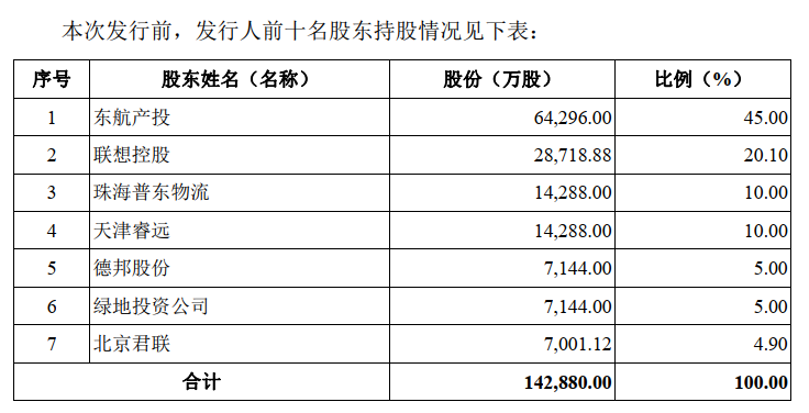 东航物流诞生于2004年,前身是东远物流;2013年,公司名称变为东航物流有限;2017年,引入联想控股、珠海普东物流、德邦股份、绿地投资公司、天津睿远(东航物流员工持股平台)等机构增加注册资本及股权转让。2018 12 19 日,东航物流有限改制为东航物流。