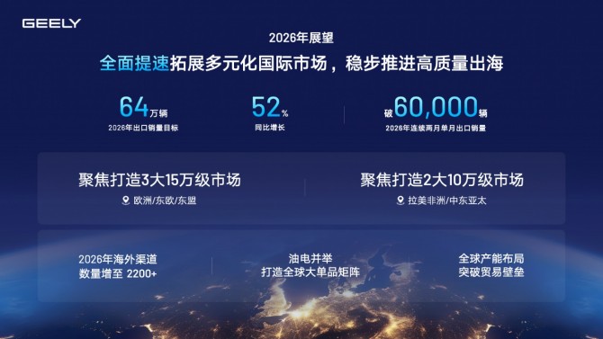 通过产品出海、技术出海与产业体系出海的协同推进,吉利汽车正加速构建全球化产业布局。2026年,吉利汽车1-2月连续两个月单月出口销量超过6万辆,同比大涨129%,国际化业务驶入增长快车道。