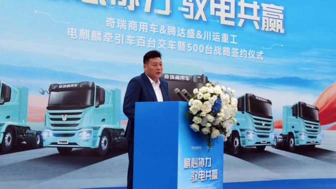 2026年3月12日,以“麒心协力 驭电共赢”为主题的奇瑞商用车&腾达盛&川运重工电麒麟牵引车百台交车暨500台战略签约仪式在四川德阳隆重举行。现场电麒麟牵引车整齐列阵,共启西南绿色物流迈向规模化运营的关键一步。
